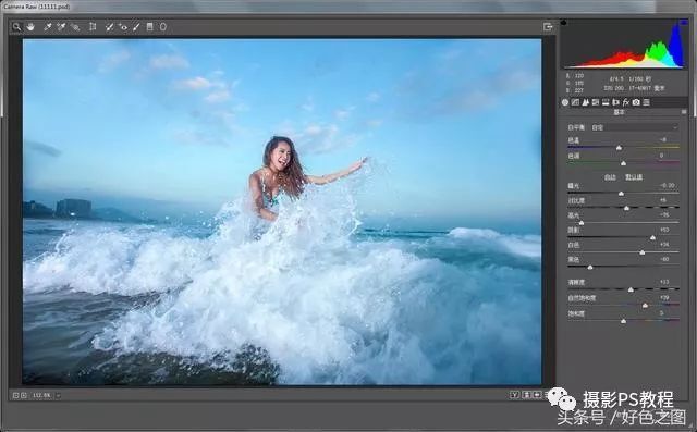 接下来在滤镜中找到Camera Raw滤镜,点击后弹出调整界面,开始在基本面板内调整色温、曝光、清晰度和自然饱和度: