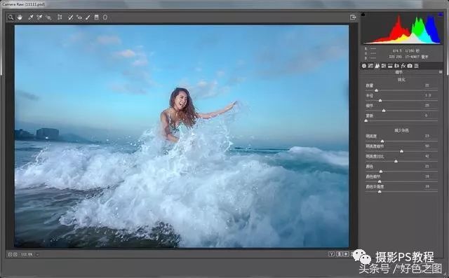 在这个步骤中,又将高光和亮调压低了一些,让片中过亮的地方官暗下来,使浪花体现出细节。然后就做一下锐化,减少一下噪点,进入细节面板: