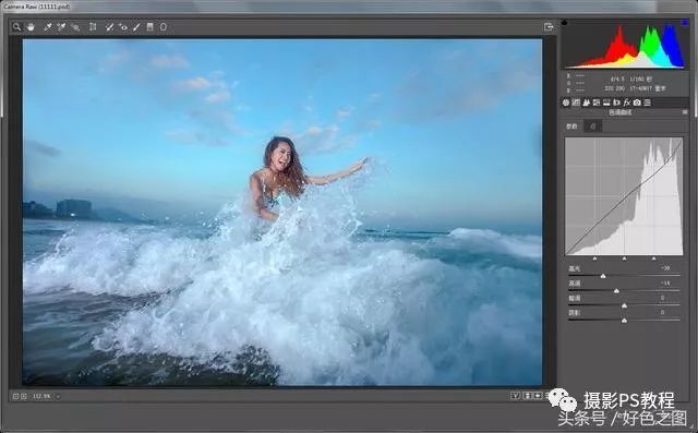 经过第一步调整,照片就已经出现点效果了,因为是在海边,所以我将色温向蓝色调整了一点点,使照片偏蓝。增加了自然饱和度,让蓝色更鲜艳一些。又分别对高光和阴影,白色和黑色做了调整,使照片曝光正常。下一步做曲线调整,点击色调曲线面板,继续调: