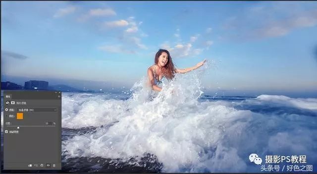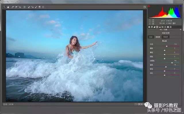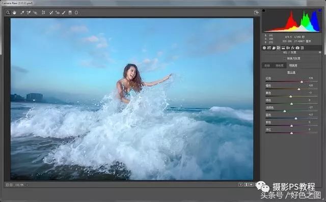 增加红色和橙色的亮度,使人物肤色明亮一些,压暗一点海水和天空,再来调整色相: