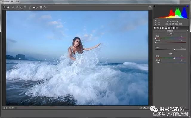通过调整色相,让照片中的各种颜色更接近我们想要的效果。接着再来调整照片暗部的颜色,我们进入分离色调面板,将暗部调整的偏蓝色一些:
