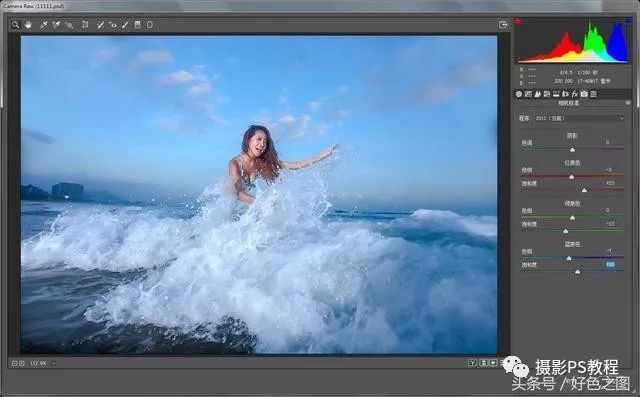 因为原片中人物比较灰,肤色不好看,所以我增加了一点红色饱和度,先大概给皮肤定个色调,浅绿色和蓝色主要是针对海水和天空。接下来调整明亮度: