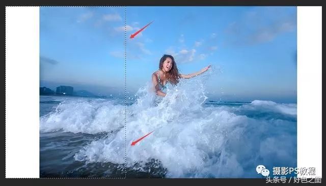 位置大家自己掌握,觉得差不多就可以了,敲回车确定裁切。这时候大家会发现,照片两边空着的地方存在刚才裁切出来的白色或黑色(这个颜色取决于你的背景色设置),接下来,使用矩形选框工具(快捷键M),将左右任意一边人物之外的内容圈选起来: