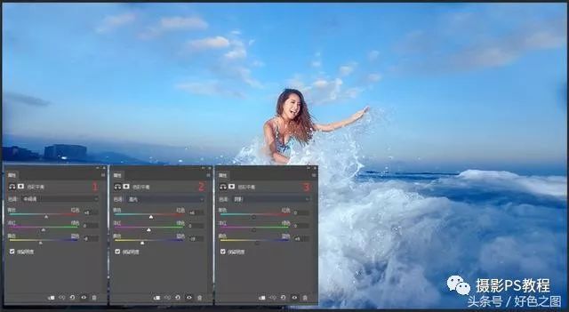 接下来建立色彩平衡调整图层,针对高光、中间调、暗部继续调整色彩。中间调和高光都偏黄和红一点,暗部加一点蓝就可以了: