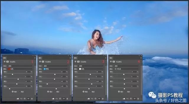 是不是感觉整个场景的变大了,看着舒服些了。接下来,我们继续来做颜色的细化处理,首先在图层面板中建立“可选颜色”调整图层,大家留心观察,这张照片的拍摄时间是下午,快到傍晚的时分,照片顺光拍摄,太阳的位置在模特脸颊的证对面,这样说来,这个时间段的人物应该是偏红色的,所以,先在红色中,减少青色,肤色变红,减一点黄色,再减少黑色,让皮肤亮一点。再到青色中调整天空和海水,适当调整白色和中性色: