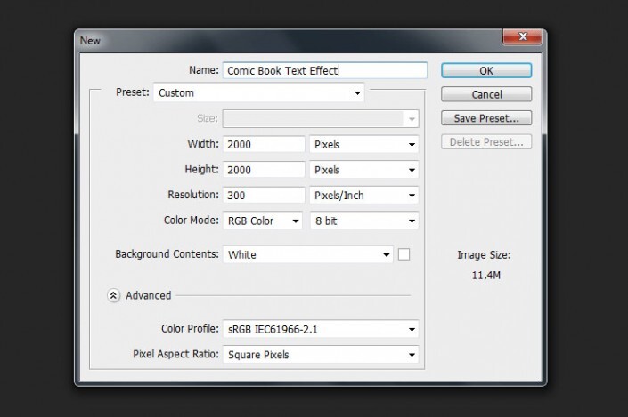 1、单击“文件”>“新建”,打开Photoshop并创建新文档。用2000 px制作了文件2000像素(由于使用的是像素,因此分辨率并不重要)。将文件命名为“漫画书文字效果”。