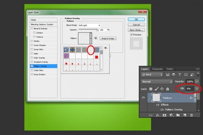 3、创建一个新图层。用任何颜色填充并将填充更改为0%。双击该图层以显示图层样式窗口并应用此图案。