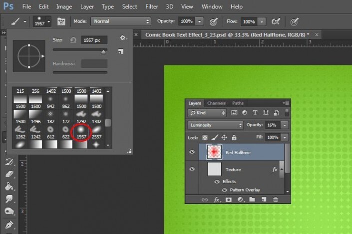4、创建一个新图层。选择画笔工具(B),然后将画笔大小设置为1957像素。可以使用你想要的任何颜色。现在将半色调放在文档的中心。此外,将填充层更改为Luminosity,填充率为16%。