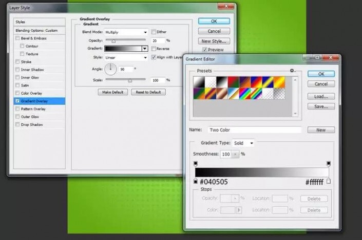 2、为背景添加渐变,双击背景图层以显示图层样式窗口并应用此设置。