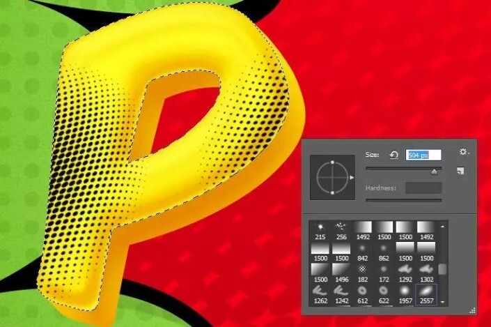 17、在字母“P”上添加一些半色调画笔。转到原始图层“P”,从中进行选择。创建一个新图层并抓住画笔工具。使用#000000,将半色调放在字母上。