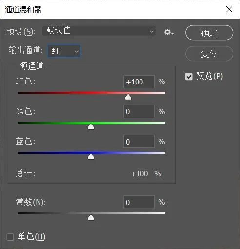 在调整通道中,红色通道右边代表的是红色,左边代表的就是青色