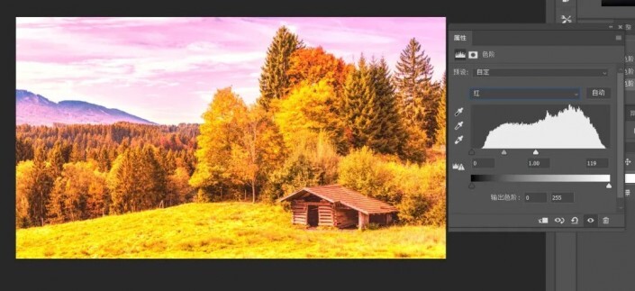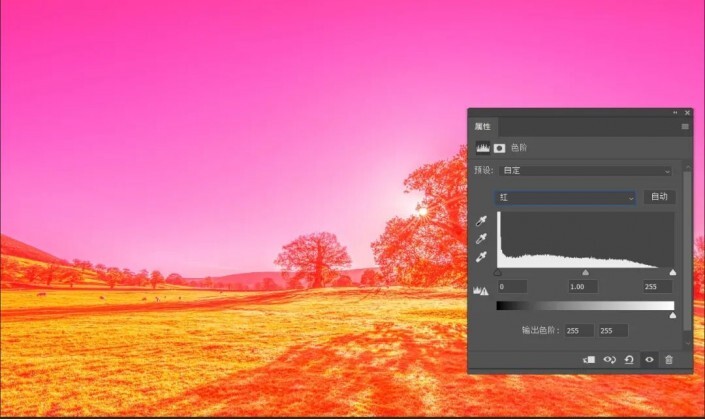先分析一下,黄色是由红色和绿色叠加组成的,而这个图天空是蓝色的,我们需要将它变为绿色或者红色,再利用通道进行调节第一步:我们打开红色通道,直接将输出色阶调整为255,255