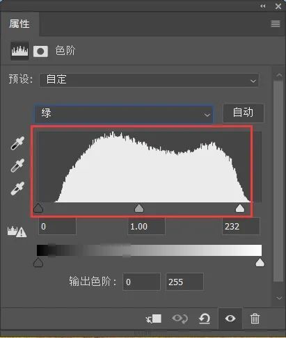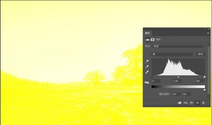 第二步:打开绿色通道,将输出色阶调整为255,255,此时画面就已经变成黄色的色系了