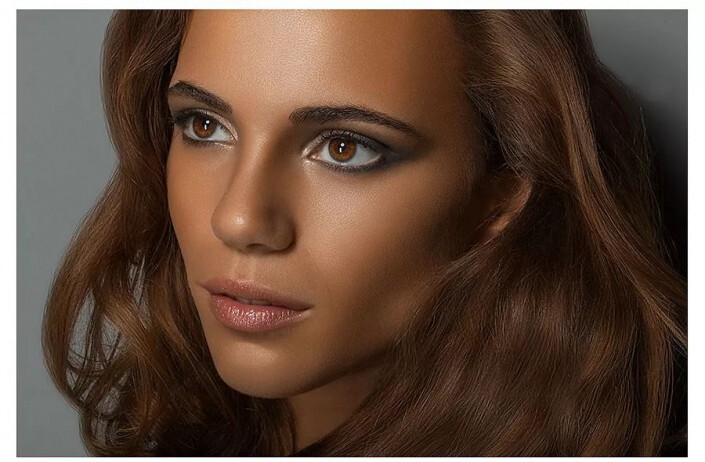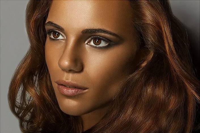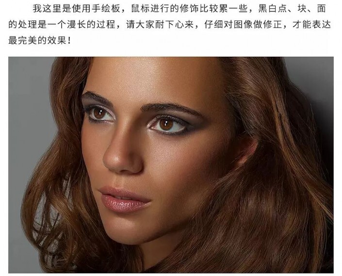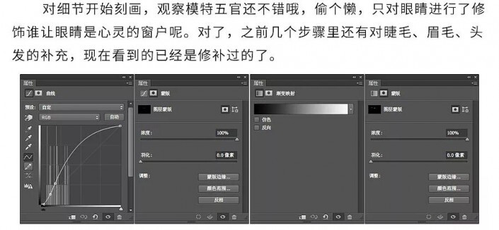 对细节开始刻画,观察模特五官还不错哦,偷个懒,只对眼睛进行了修饰谁让眼睛是心灵的窗户呢。对了,之前几个步骤里还有对睫毛、眉毛、头发的补充,现在看到的已经是修补过的了。