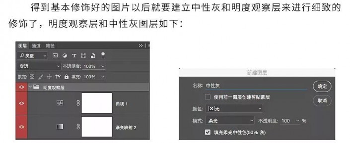 得到基本修饰好的图片以后就要建立中性灰http://www.yuucn.com/tags/38464/和明度观察层来进行细致的修饰了,明度观察层和中性灰图层如下: