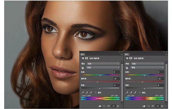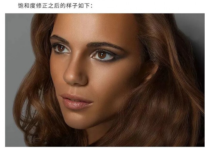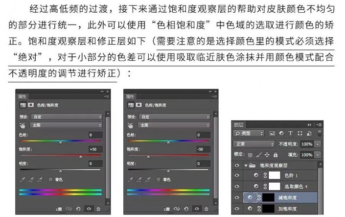 经过高低频的过渡,接下来通过饱和度观察层的帮助对皮肤颜色不均匀的部分进行统一,此外可以使用“色相饱和度”中色域的选取进行颜色的矫正。饱和度观察层和修正层如下(需要注意的是选择颜色里的模式必须选择