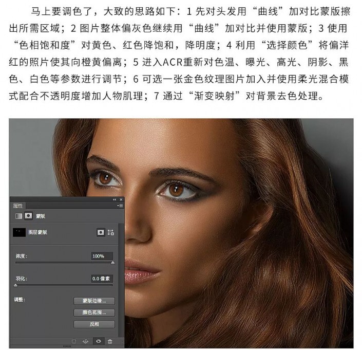 马上要调色了,大致的思路如下:1先对头发用“曲线”加对比蒙版http://www.yuucn.com/tags/38847/擦出所需区域; 2图片整体偏灰色继续用“ 曲线”加对比并使用蒙版; 3使用“色相饱和度”对黄色、红色降饱和,降明度; 4利用“选择颜色”将偏洋