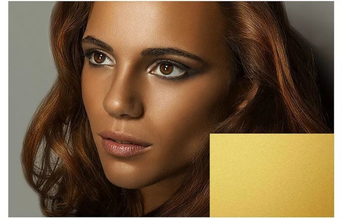 红的照片使其向橙黄偏离; 5进入ACR重新对色温、曝光、高光、阴影、黑色、白色等参数进行调节; 6可选一张金色纹理图片加入并使用柔光混合模式配合不透明度增加人物肌理; 7通过“渐变映射”对背景去色处理。