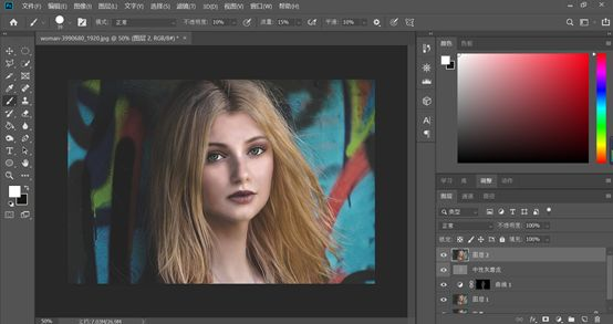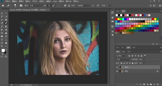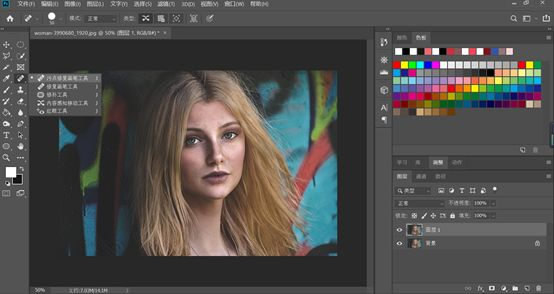 1、首先我们打开练习素材,Ctrl+J复制一层背景,然后使用污点修复画笔工具和修复画笔工具(按住Alt键选择取样点后涂抹使用)进行修复
