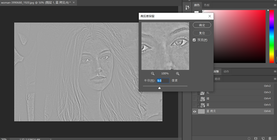 4、执行【滤镜】-【其他】-【高反差保留】,半径大小为9,如下图