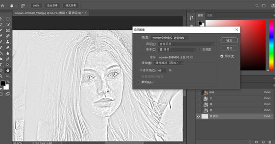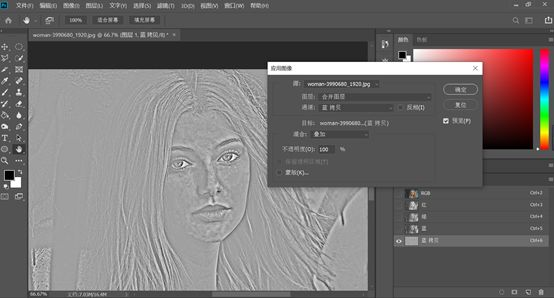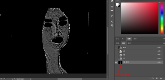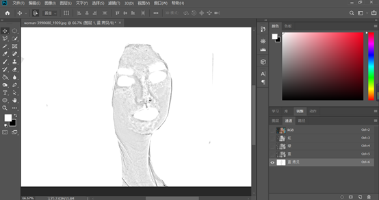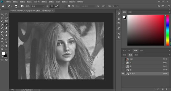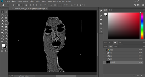 我们选择蓝色通道,原因是因为蓝色通道显示的面部细节比较多,红色和绿色通道偏近于白色,面部显示的细节较少