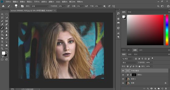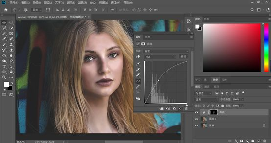 9、保持选区,点击在通道中点击RGB通道,回到原来的图层窗口。在图层下面的调整图层中找到曲线,将面部提亮,如下图