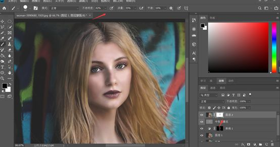 16、然后修改画笔不透明度和流量,涂抹面部以外的区域,如下图