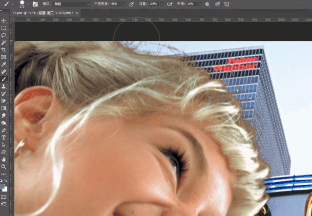 (6)接着切换为画笔工具,模式为“颜色”,降低画笔不透明度,选中头发图层,然后使用画笔在头发边缘涂抹,将头发“染”成蓝色,与建筑更好地融合;