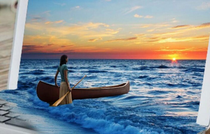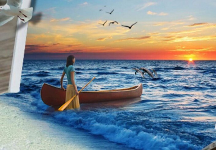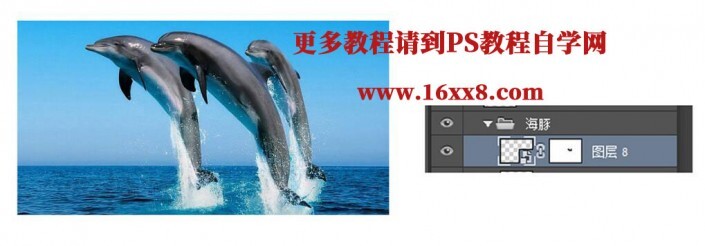 第10步:大致抠出海豚,转换为智能对象,调节大小,放置于海面上,加图层蒙版擦除尾巴下面被海水遮住的部分。