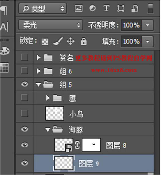 第11步:给海豚加阴影,新建图层,用黑色柔角画笔在海豚下方涂抹,将混合模式改为柔光