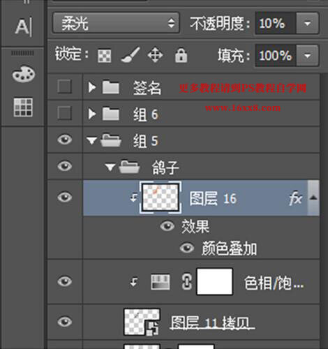 第15步:同理鸽子的环境色有大海的蓝色,还有夕阳的橙黄色,所以新建图层,吸取夕阳橙黄色,涂抹鸽子尾巴和翅膀末端,图层模式柔光,根据自己画面颜色调整透明度。其实好像没有很大差别--不过不重要,重要的是你要知道要有这个色