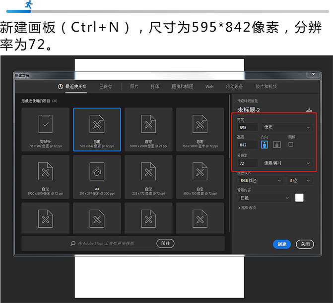 新建画板( CtrI+N ),尺寸为595*842像素,分辨率为72