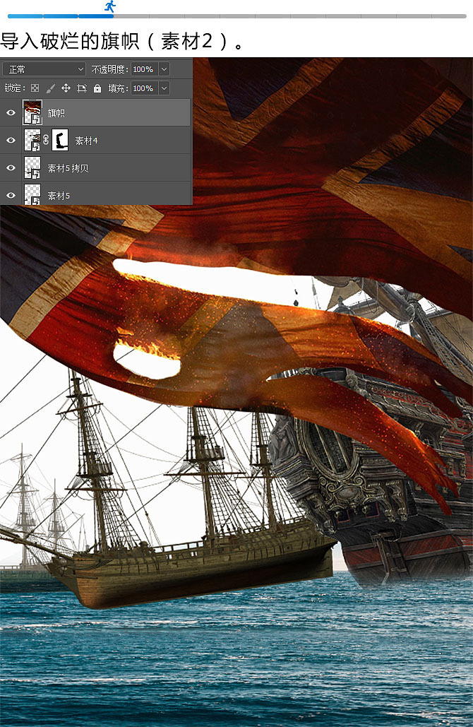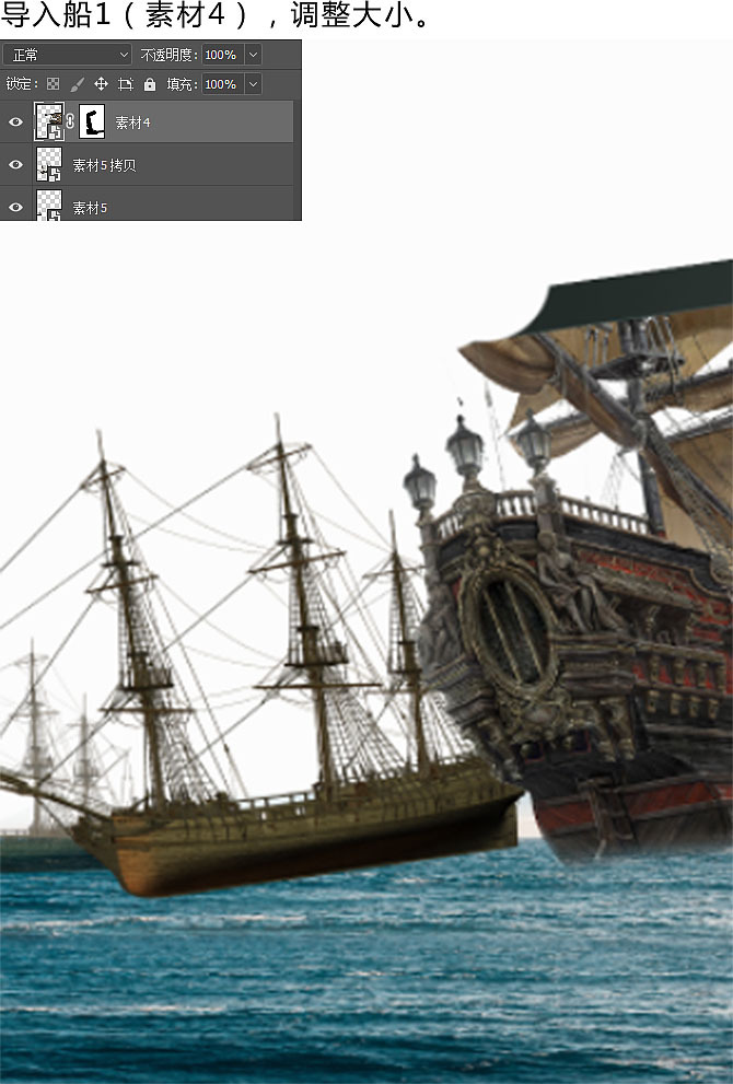 拷贝素材5的船,变形调整大小后,右键选择水平对称放置在合适的位置上