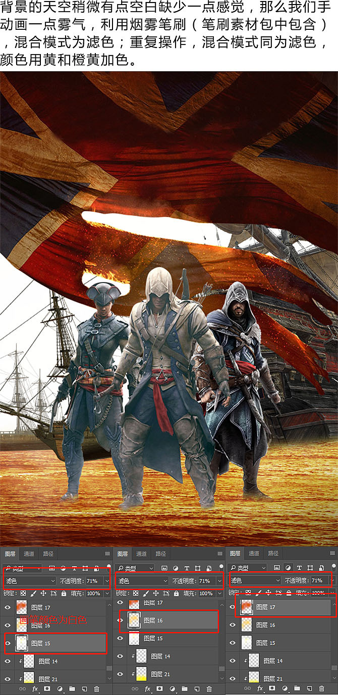 背景的天空稍微有点空白缺少一-点感觉,那么我们动画一点雾气,利用烟雾笔刷(笔刷素材包中包含),混合模式为滤色;重复操作,混合模式同为滤色,颜色用黄和橙黄加色。