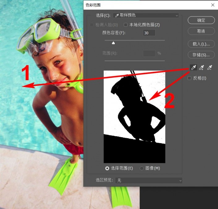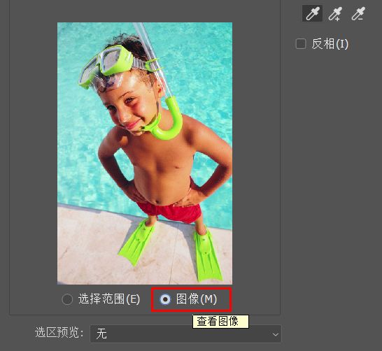在“色彩范围”对话框内,预览有两种模式——选择范围、图像。这两种模式主要控制对话框中的预览图的显示效果。