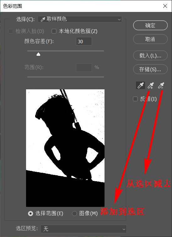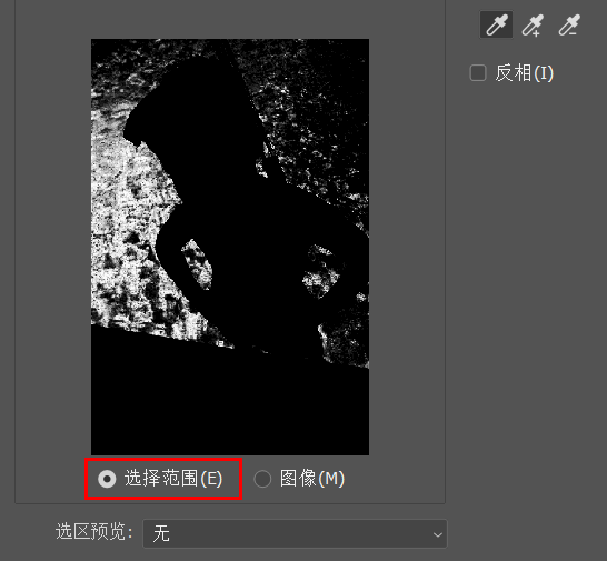(1)当切换为“选择范围”模式后,“色彩范围”对话框中的预览图是黑白图像。