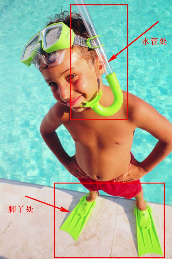 接着对图像进行分析:(1)主体人物是小男孩,背景分为两部分:蓝绿色的水池、瓷砖构成的地面;(2)小男孩有3/4的身体都在水池中,除了头发比较杂乱外,其他部位轮廓清晰,与背景对比较明显,所以在抠图过程中,思路就比较清晰了,头发作为一部分单独处理,其他部位作为另外一部分单独处理;(3)对于头发而言,小男孩的头发呈棕黑色,而水池中的水呈蓝绿色,颜色相差比较大,所以可以考虑使用“色彩范围”命令抠出头发;(4)除了头发的其他部位,相对容易抠,但是再观察你会发现:脚丫、水管这两个部位几乎都是由直线构成,因此非常适合【钢笔工具】、【多边形套索工具】;