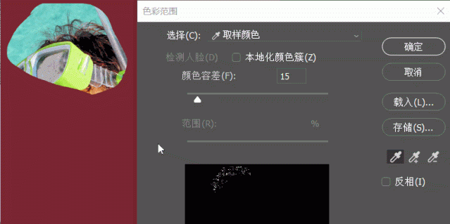 (3)选中【头发】图层,执行:【选择】-【色彩范围】,打开“色彩范围”对话框。a)将鼠标光标移动到图像中的蓝绿色海水中,点击拾取颜色;b)接着将“颜色容差”的滑块拉到最大;【PS】:为什么要拉到最大?因为这是我多次试验得出的结果,“颜色容差”这个参数对于选区的生成有着非常大的影响,要找到一个合适的容差,只能不断尝试。c)点击确定后,生成的选区是外围海水的选区,此时直接按下Del键,把选区删除;