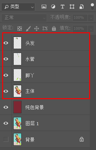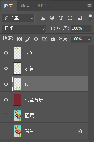 经过以上4步,水管、脚丫这两个部位已经抠好,并且各个占一个图层,再算上之前的【头发】层,现在看一下三个图层叠加后的效果: