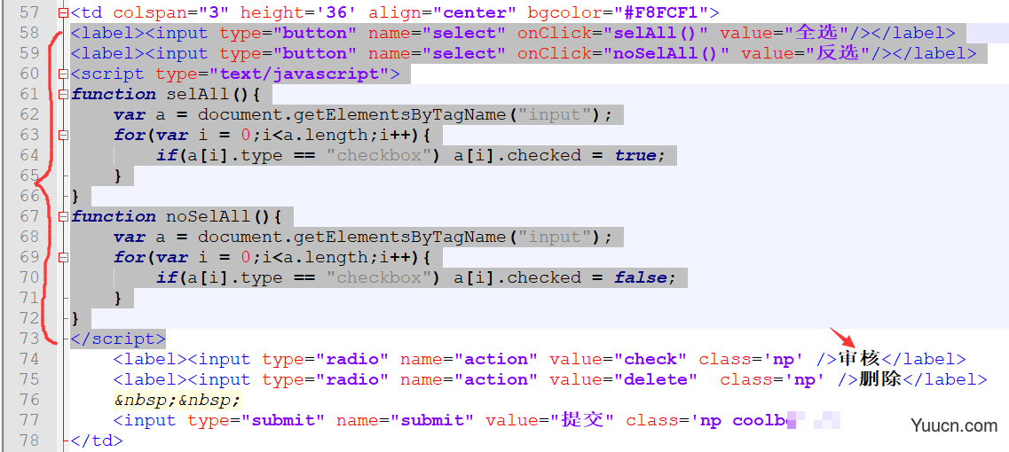 <label><input type="button" name="select" onClick="noSelAll()" value="反选"/></label>