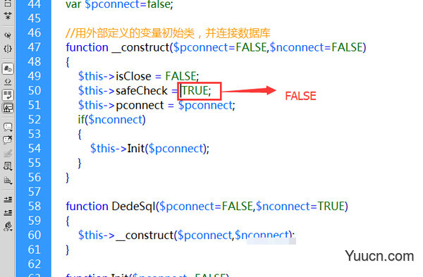 打开dedecms系统中的include目录下的 dedesql.class.php文件,找到构造函数(第47行)