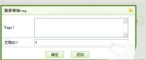 在 //获得批量属性处理的AJAX窗体 这个模块下面(注意,这里是指整个模块结束)增加下面的代码用于显示批量增加tags的对话框