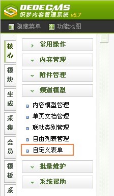 自定义表单位于主菜单“核心”选项卡下的[频道模型]——[自定义表单],如图一: