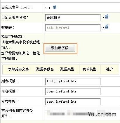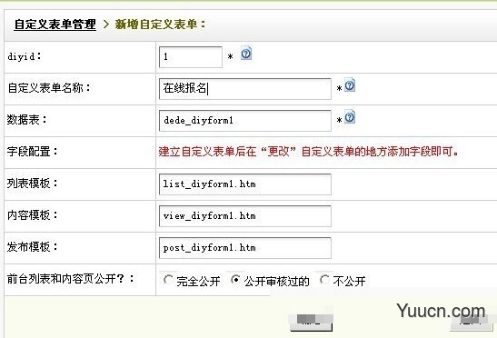 'dede_diyform1' 是你要调用的表的名称 [field:dosxp/] 是你添加的表的字段名称, 要想无需审核 提交之后立刻显示, 在增加新表单的“前台列表和内容页公开?:”选项选择“完全公开” 。