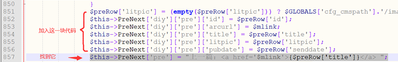 $nextRow['litpic'] = (empty($nextRow['litpic'])) ? $GLOBALS['cfg_cmspath'].'/images/defaultpic.gif' : $nextRow['litpic']; $this->PreNext['diy']['next']['id'] = $nextRow['id']; $this->PreNext['diy']['next']['arcurl'] = $mlink; $this->PreNext['diy']['next']['title'] = $nextRow['title']; $this->PreNext['diy']['next']['litpic'] = $nextRow['litpic']; $this->PreNext['diy']['next']['pubdate'] = $nextRow['senddate']; |