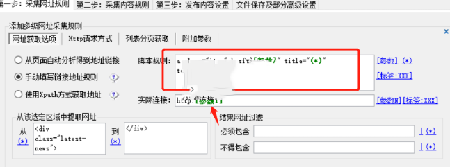 在网址获取选项里点选“手动填写链接地址规则”,
