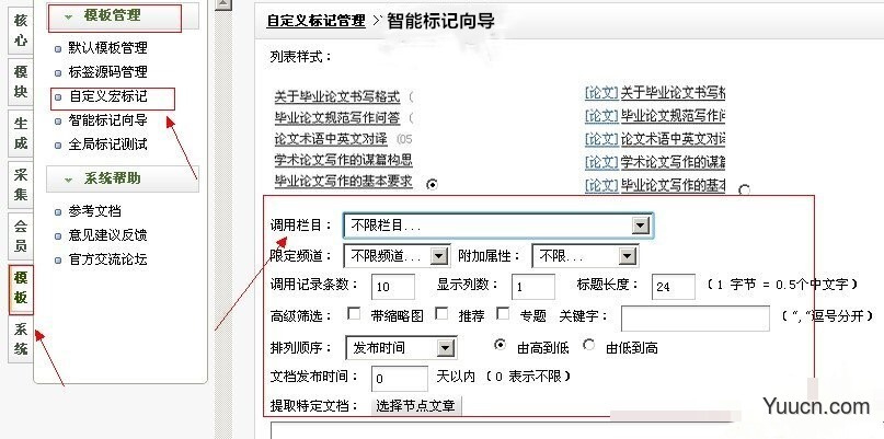 1、在网站后台系统中,进入到“模板”->“模块管理”->“自定义宏标记”,然后点击“智能标记向导”进入智能标记生成向导界面