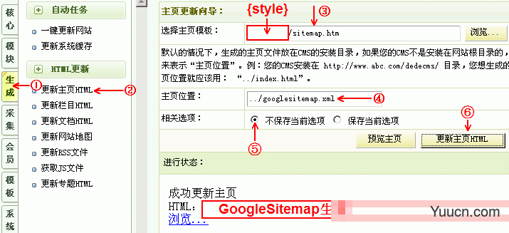 第二步:生成HTML就可以了,如图所示:选择主页模板选择刚才制作的sitemap.htm 主页位置改为:googlesitemap.xml然后生成。