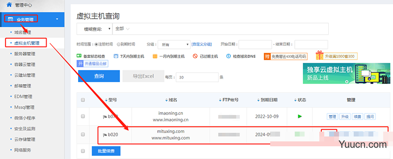 西部数码为例,点击业务管理->虚拟主机管理->找到自己的网站->管理(如下图所示)