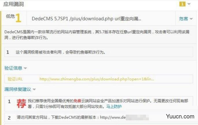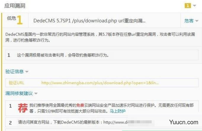 最近使用scanv网站体检发现有DedeCMS 5.7SP1 /plus/download.php url重定向漏洞(如下图),对比官方网站最新下载包发现该漏洞未进行补丁,但官方自身网站已经补上了,而官方演示站点均未补上。